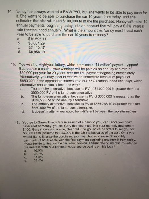 Calculate the present value of the following cash flows discounted at 10 percent. Lottery officials offer you the choice of the following alternative payouts: The annuity’s first payment occurs at the end of year 6. The annual interest rate is 12 percent for years 1 through 5, and 15 ... Get Document